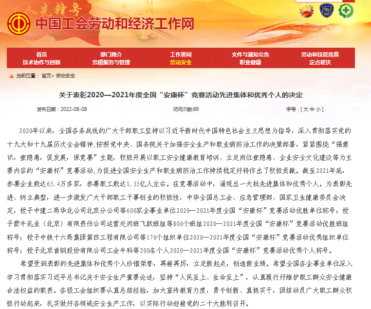 8月8日,中华全国总工会、应急管理部、国家卫生健康委员会联合发布了关于表彰2020-2021年度全国“安康杯”竞赛活动先进集体和优秀个人的决定,江南网投荣获2020—2021年度全国 “安康杯”竞赛优胜单位荣誉。